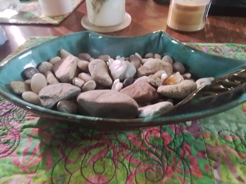 These rocks, that I've collected haven't changed, so why should I? That is my attitude now. They just sit there all day, never moving, and I don't hear them complaining. This thrift store find candy dish has been their home, and they have had no desire or yearning to leave it.
